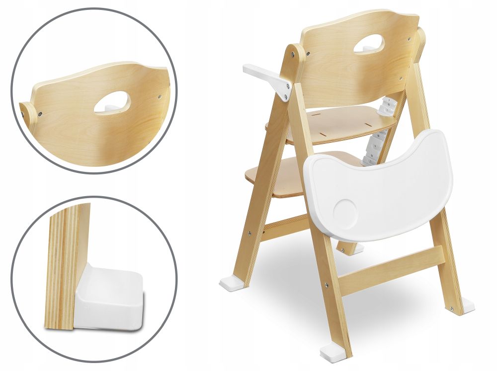 Specjalna konstrukcja z wytrzymałego drewna brzozowego pozwala na korzystanie z krzesełka aż do osiągnięcia wagi nawet 40 kg przez pociechę. Krzesełko do karmienia przeznaczone jest dla dzieci o wadze do 15 kg.