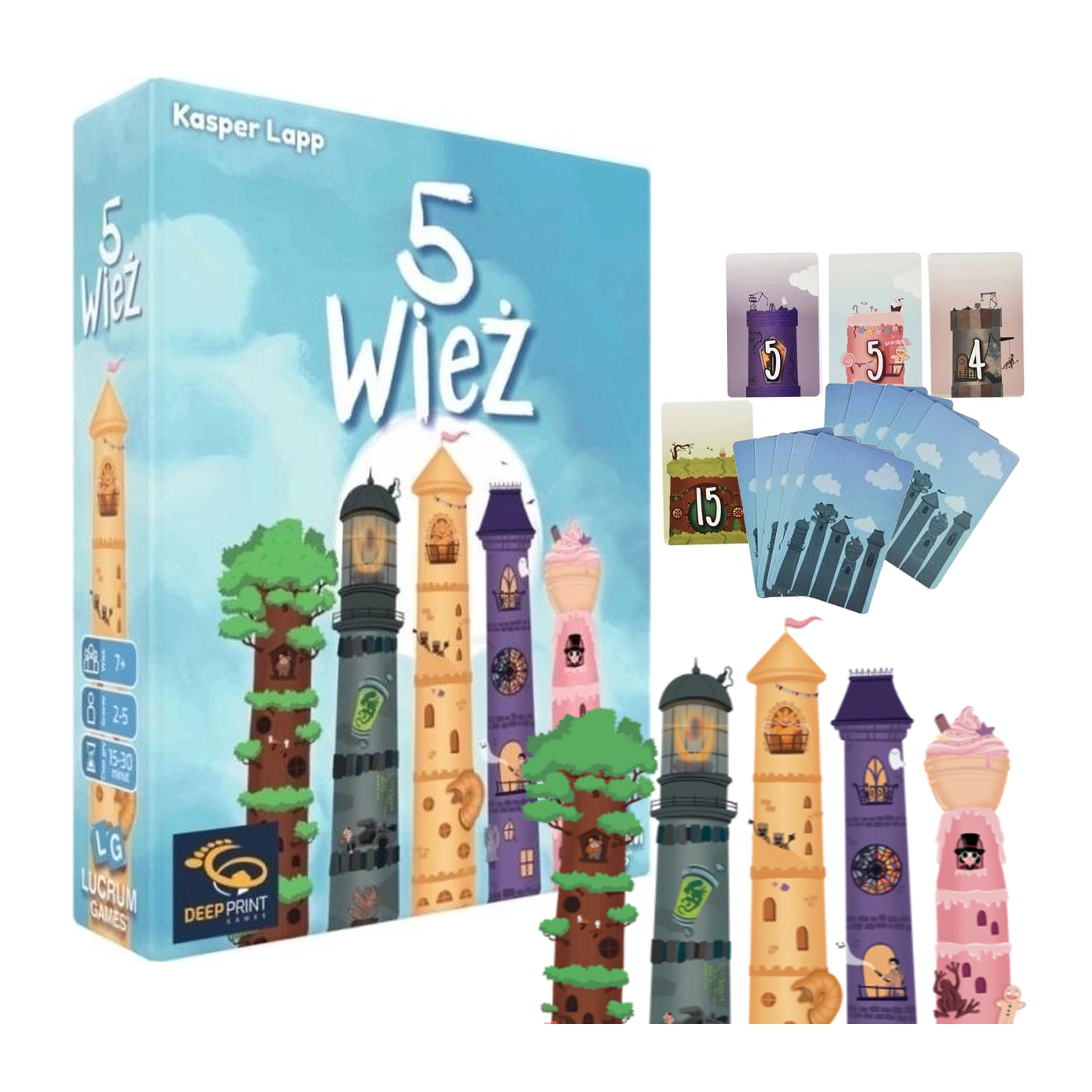 „5 Wież” to gra, w której najważniejsze są umiejętność licytowania, rozsądne zarządzanie kartami oraz planowanie kolejnych ruchów. Celem jest zdobycie jak największej liczby punktów, przyznawanych za tworzenie najwyższych wież zakończonych specjalnymi kartami dachów.
