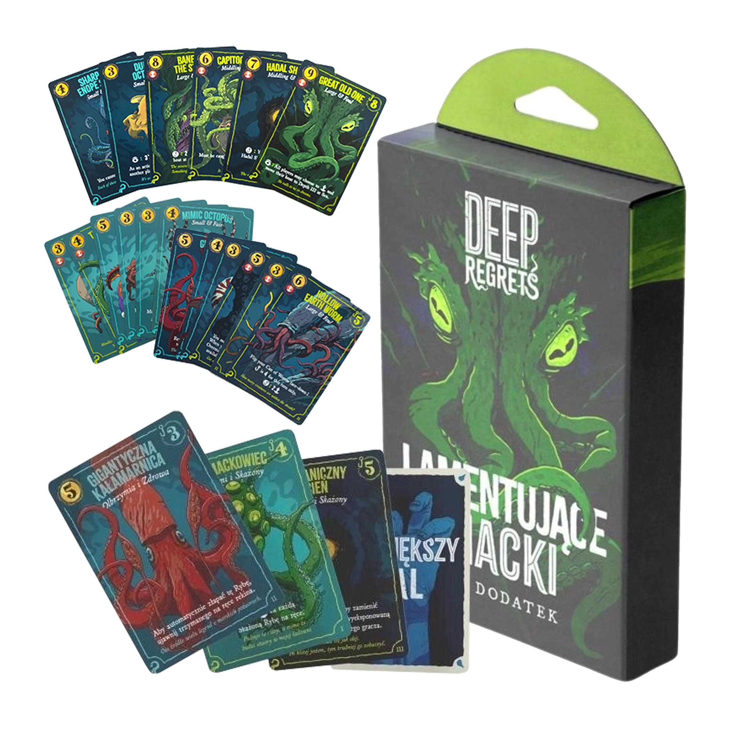 Deep Regrets: Lamentujące Macki to fascynujący dodatek do strategicznej gry planszowej Deep Regrets, opracowany przez wydawnictwo Alis Games. Rozszerzenie wprowadza zupełnie nowe elementy, które wzbogacają podstawową rozgrywkę, dodając jej głębi, emocji oraz świeżych możliwości taktycznych.