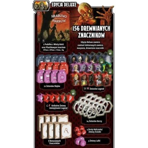 Komponenty gry wykonano z wysokiej jakości drewna, kartonu, papieru i plastiku, co zapewnia jej trwałość oraz estetyczny wygląd. Staranność wykonania sprawia, że „Hrabstwo Harrow” prezentuje się wyjątkowo elegancko i będzie cieszyć graczy przez długie lata.