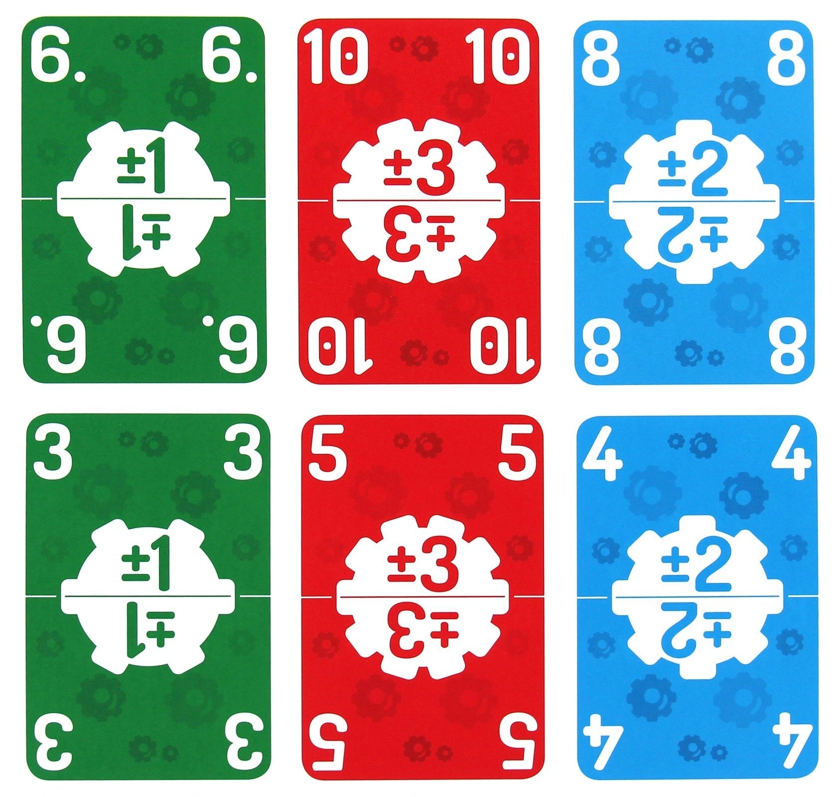 Talia składa się z kart w trzech kolorach: zielonym, niebieskim i czerwonym. Każdy kolor określa, jakie działanie należy wykonać oraz o jaką wartość zmienić liczbę.