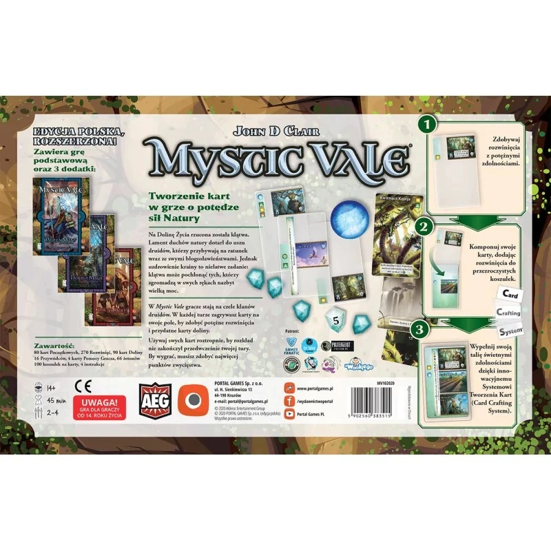 Zestaw Mystic Vale: Big Box zawiera grę podstawową Mystic Vale oraz trzy rozszerzenia: Dolina Magii, Dolina Dziczy i Burza Many. Dzięki nim rozgrywka staje się jeszcze bardziej różnorodna, a możliwości odbudowy krainy – niemal nieograniczone.
