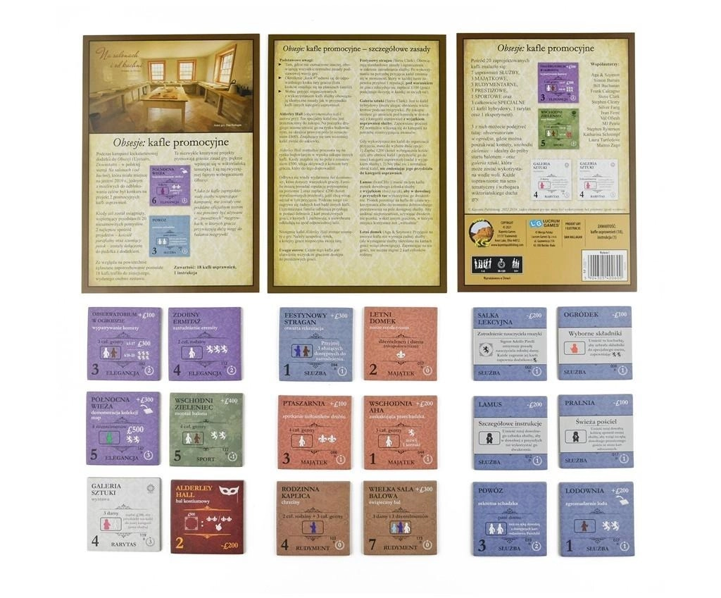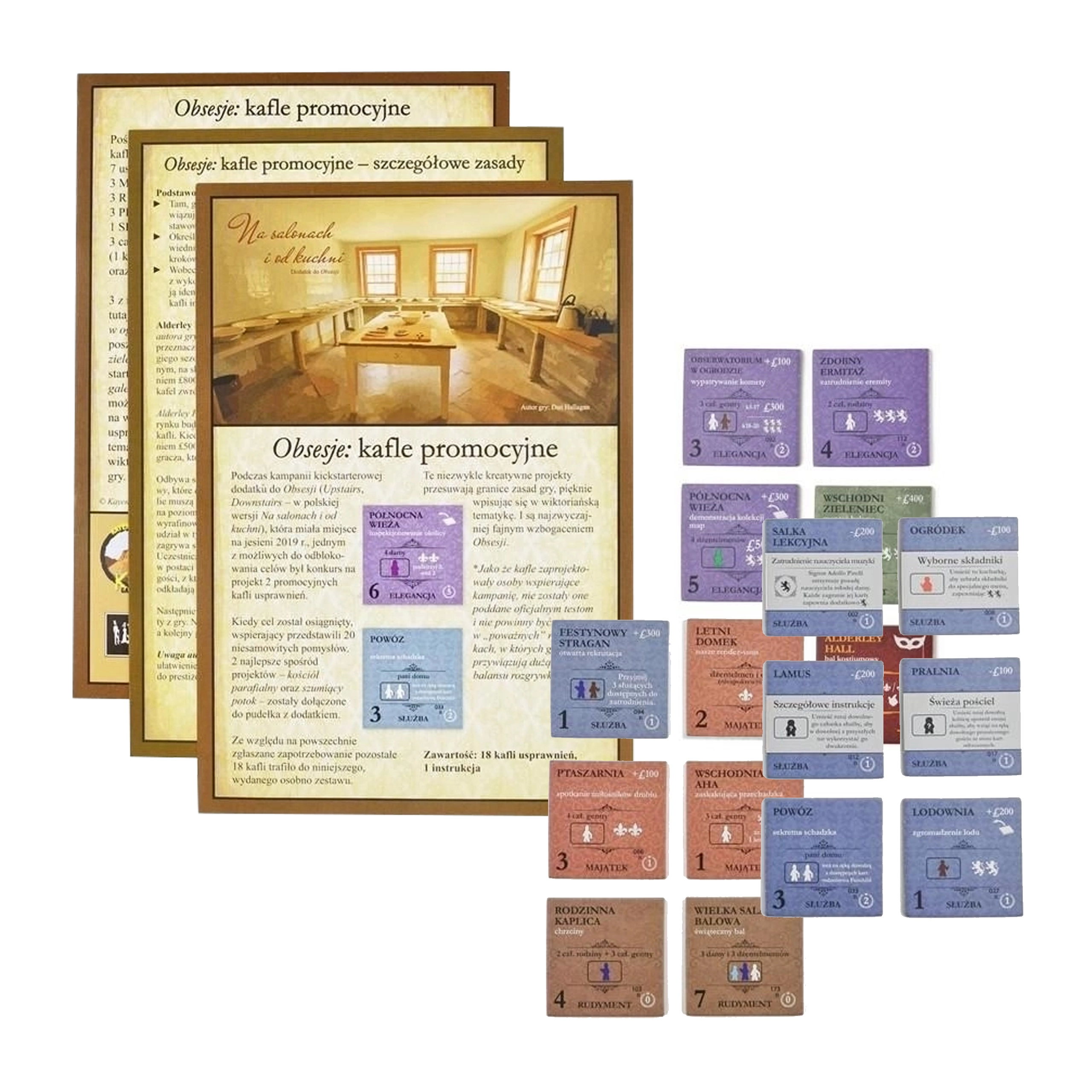 Jesienią 2019 roku odbyła się kampania kickstarterowa dodatku do gry Obsesja: Na salonach i od kuchni (ang. Upstairs, Downstairs). Jednym z możliwych do osiągnięcia celów było stworzenie konkursu na projekt dwóch promocyjnych kafli usprawnień.