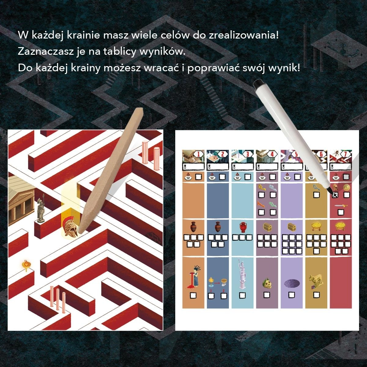 Seria „Labirynty – Minotaur” czerpie inspirację z mitologii greckiej i słynnego labiryntu pełnego tajemnic. W jego najgłębszych komnatach przetrzymywana jest Ariadna, a twoim zadaniem jest zostać jej ratunkiem. Aby to osiągnąć, musisz pokonać siedem pełnych wyzwań labiryntów, zdobywając po drodze niezbędne przedmioty, takie jak miecz i zbroja, aż w końcu stawić czoła groźnemu Minotaurowi. Możesz grać samodzielnie lub w towarzystwie przyjaciół, odkrywając różne poziomy trudności i wracając do wcześniej odwiedzonych wypraw.