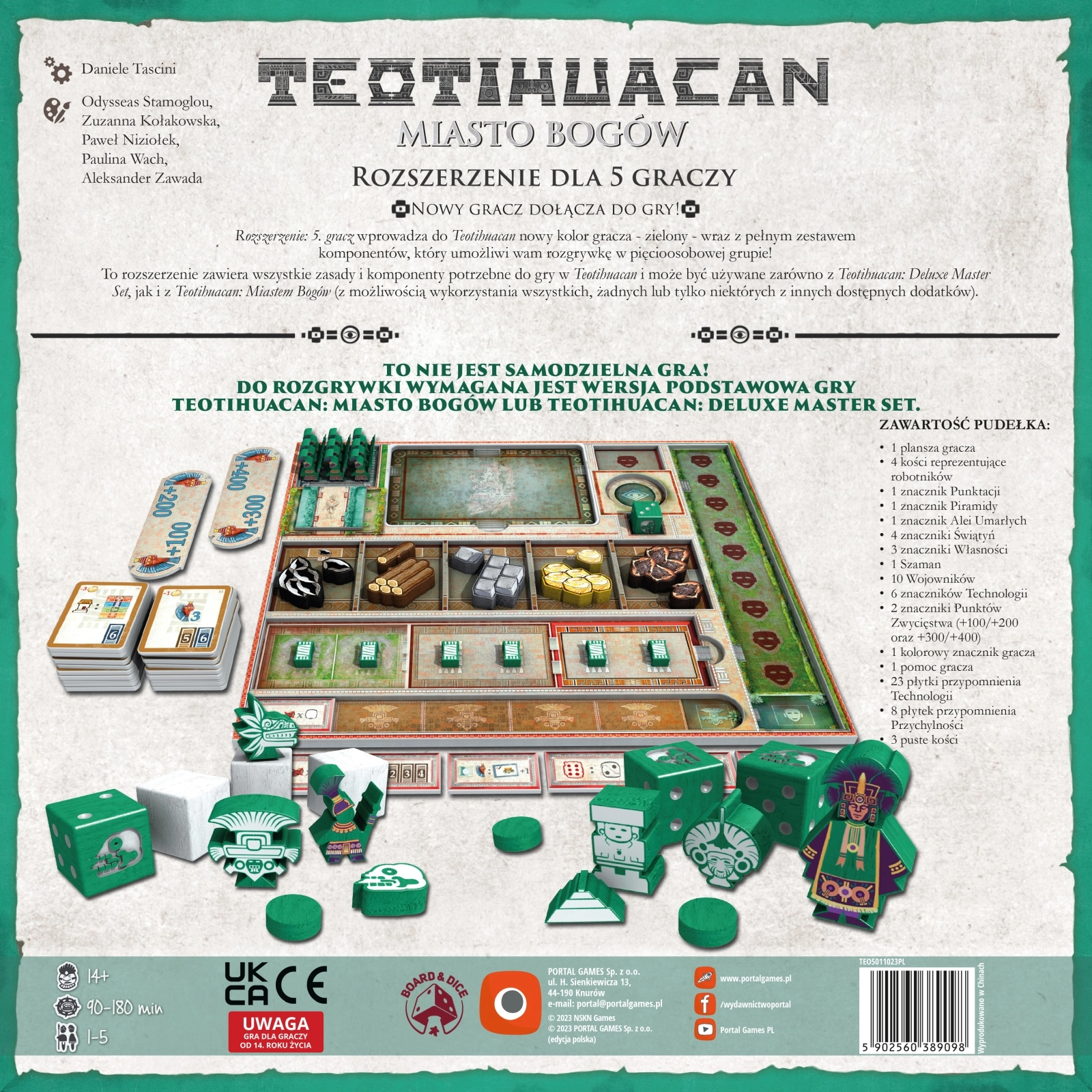 Rozszerzenie „Teotihuacan: Miasto bogów – Rozszerzenie” wprowadza możliwość gry w pięcioosobowej grupie dzięki dodaniu nowego koloru gracza – zielonego. Do zestawu dołączone są wszystkie niezbędne komponenty, które pozwolą na pełną rozgrywkę dla pięciu osób.