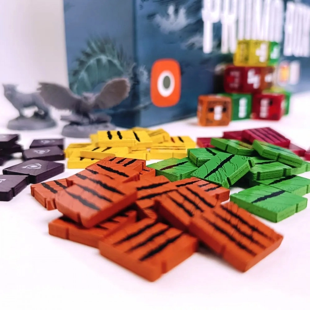 Zastąp standardowe kości wersją specjalną, ozdobioną efektem szronu. Wymień tekturowe żetony Wrogów na stylowe, drewniane znaczniki, które dodają grze elegancji i wytrzymałości.