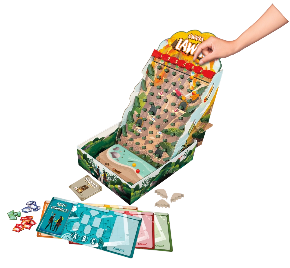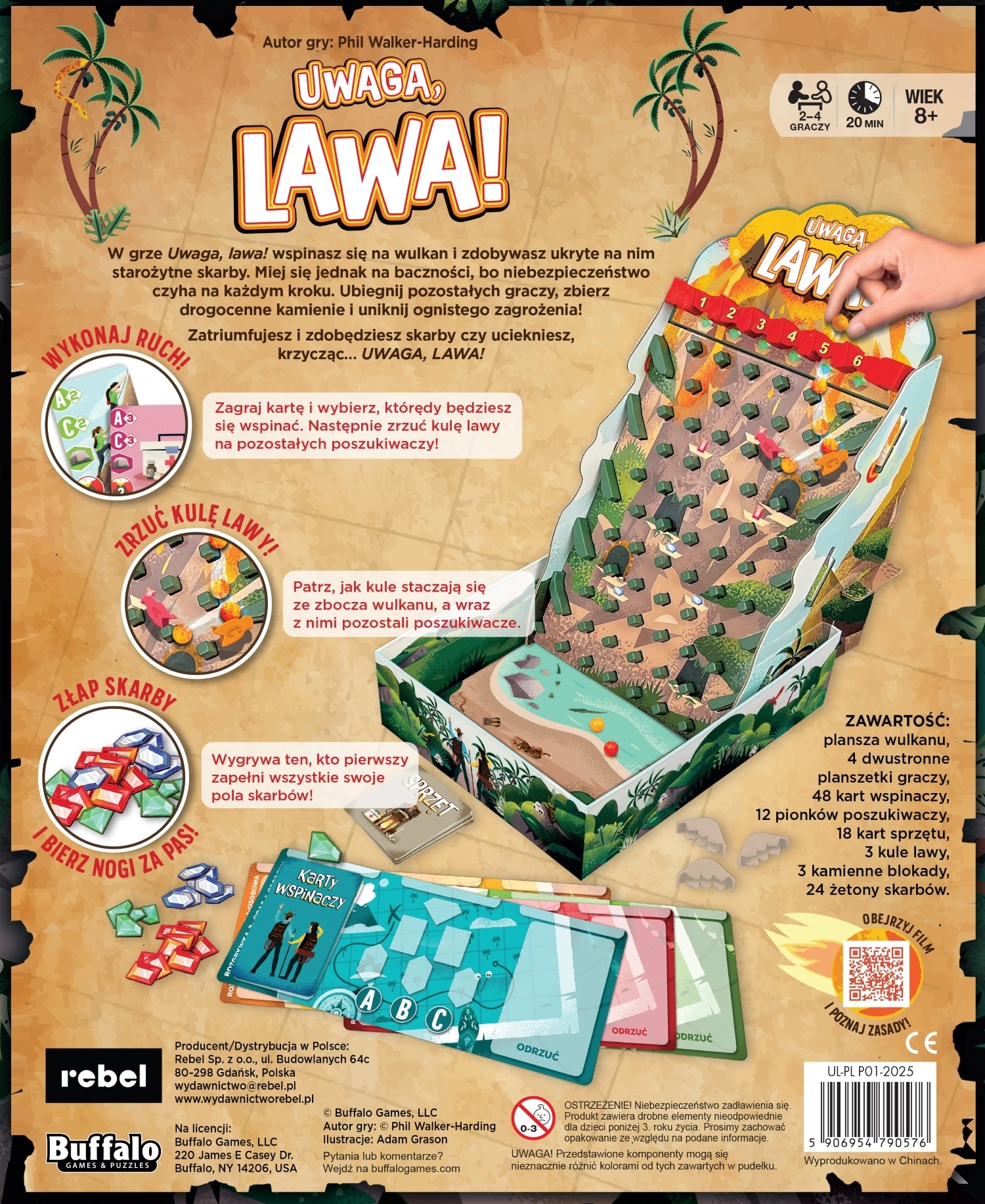 „Uwaga, lawa!” to dynamiczna, lekka gra planszowa dla całej rodziny. Gracze wcielają się w śmiałków, którzy wspinają się po zboczach wulkanu w poszukiwaniu drogocennych kamieni. Podczas rozgrywki zagrywamy karty, wykonujemy akcje i staramy się unikać toczących się kul lawy. Zwycięża ten, kto jako pierwszy zapełni swój plecak skarbami.