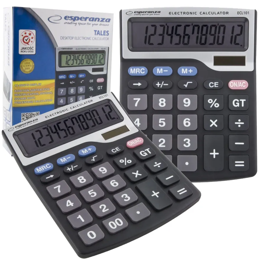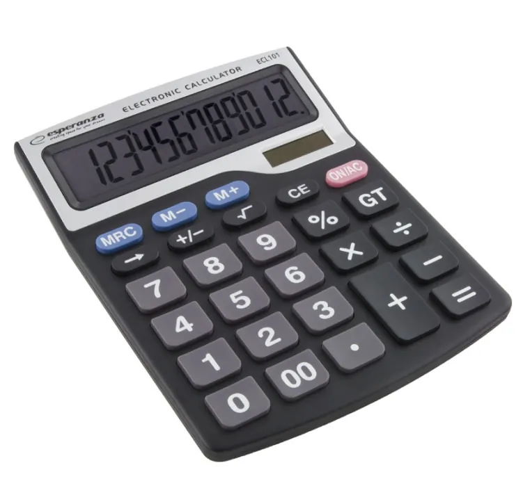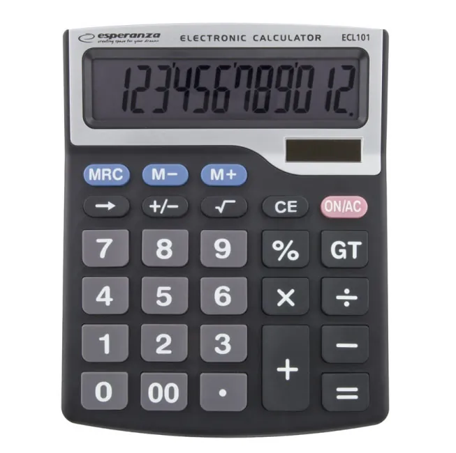 Elektroniczny kalkulator biurkowy z dużym, 12 cyfrowym wyświetlaczem. Posiada wszystkie podstawowe funkcje matematyczne (dodawanie, odejmowanie, mnożenie, dzielenie, pierwiastkowanie, obliczanie procentów), funkcję cofania wpisywanych cyfr oraz możliwość zapamiętywania wyników. Pochylony wyświetlacz, duże wyświetlane cyfry oraz duże klawisze ułatwiają pracę z kalkulatorem. Idealny do codziennego użytku w sklepach i biurach.