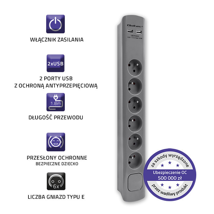 OBEZPIECZEŃSTWO TWOJE I TWOICH BLISKICHChcąc zapewnić ochronę Tobie i innym użytkownikom urządzeń podłączonych do listwy wyposażyliśmy ją w szereg zabezpieczeń: