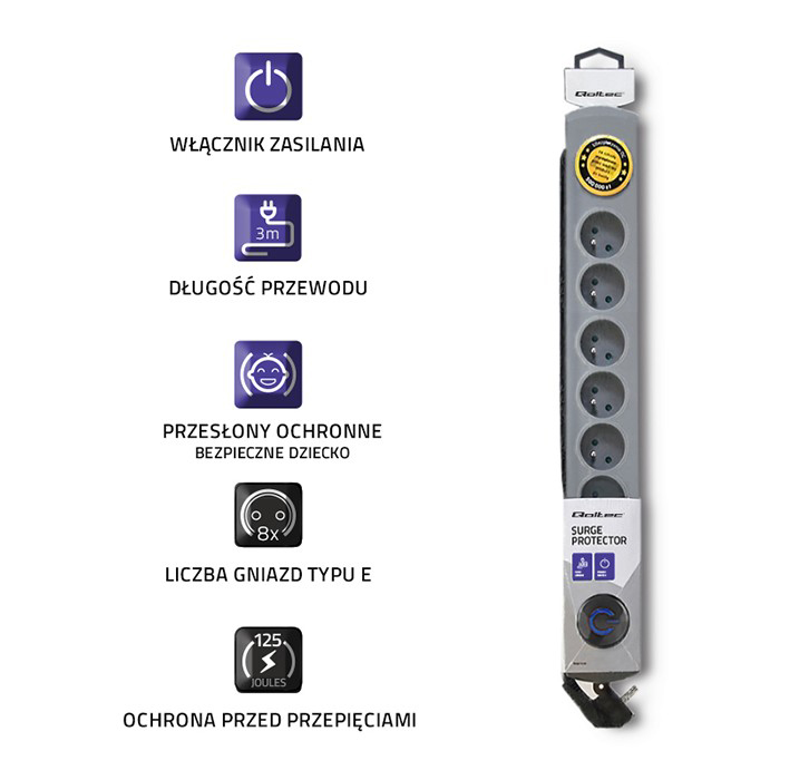 OCHRONA POPRZEZ DZIAŁANIEChcąc zapewnić ochronę Tobie i innym użytkownikom urządzeń podłączonych do listwy wyposażyliśmy ją w szereg zabezpieczeń: - zabezpieczenia antyprzepięciowe – do ochrony przed zbyt wysokim napięciem wykorzystaliśmy warystor, czyli niewielki element, który w momencie znacznego wzrostu napięcia powoduje wyłączenie listwy - przesłona ochronna we wszystkich gniazdach stanowiąca zabezpieczenie przed dziećmi – jest to szczególnie ważne w miejscach, w których dzieci są nieodłączną częścią życia - wykonanie z niepalnego materiału PP. |