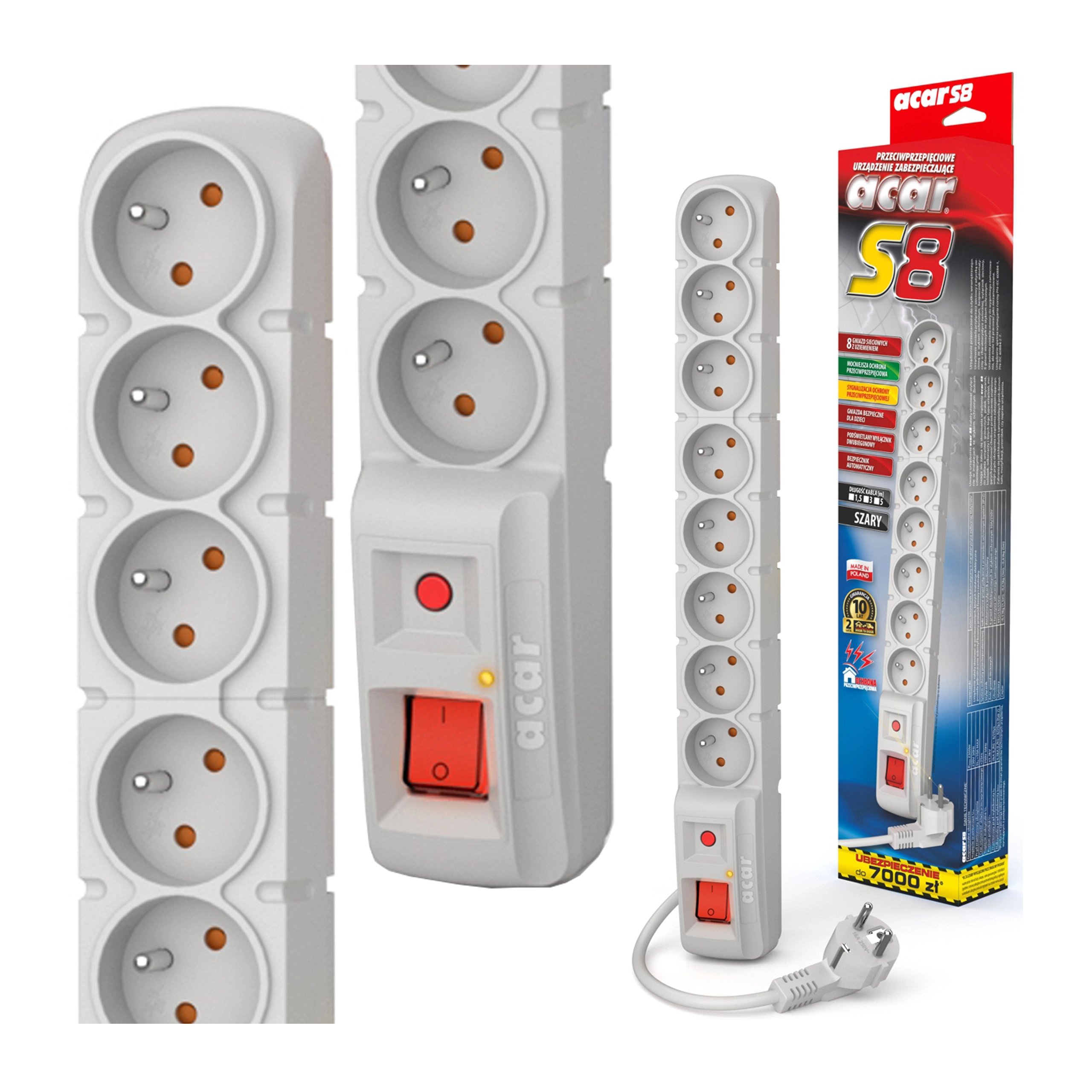 Acar S8 to zabezpieczenie przeciwprzepięciowe ośmiu urządzeń! Podświetlany wyłącznik, wygodny automatyczny bezpiecznik, cztery możliwe kierunki ułożenia sznura sieciowego, estetyczne wzornictwo, konstrukcja z wysokiej jakości niepalnego tworzywa, szybkie warystory, a także 10 letnia gwarancja oraz niska cena gwarantują najbardziej trafny wybór do biura i domu.