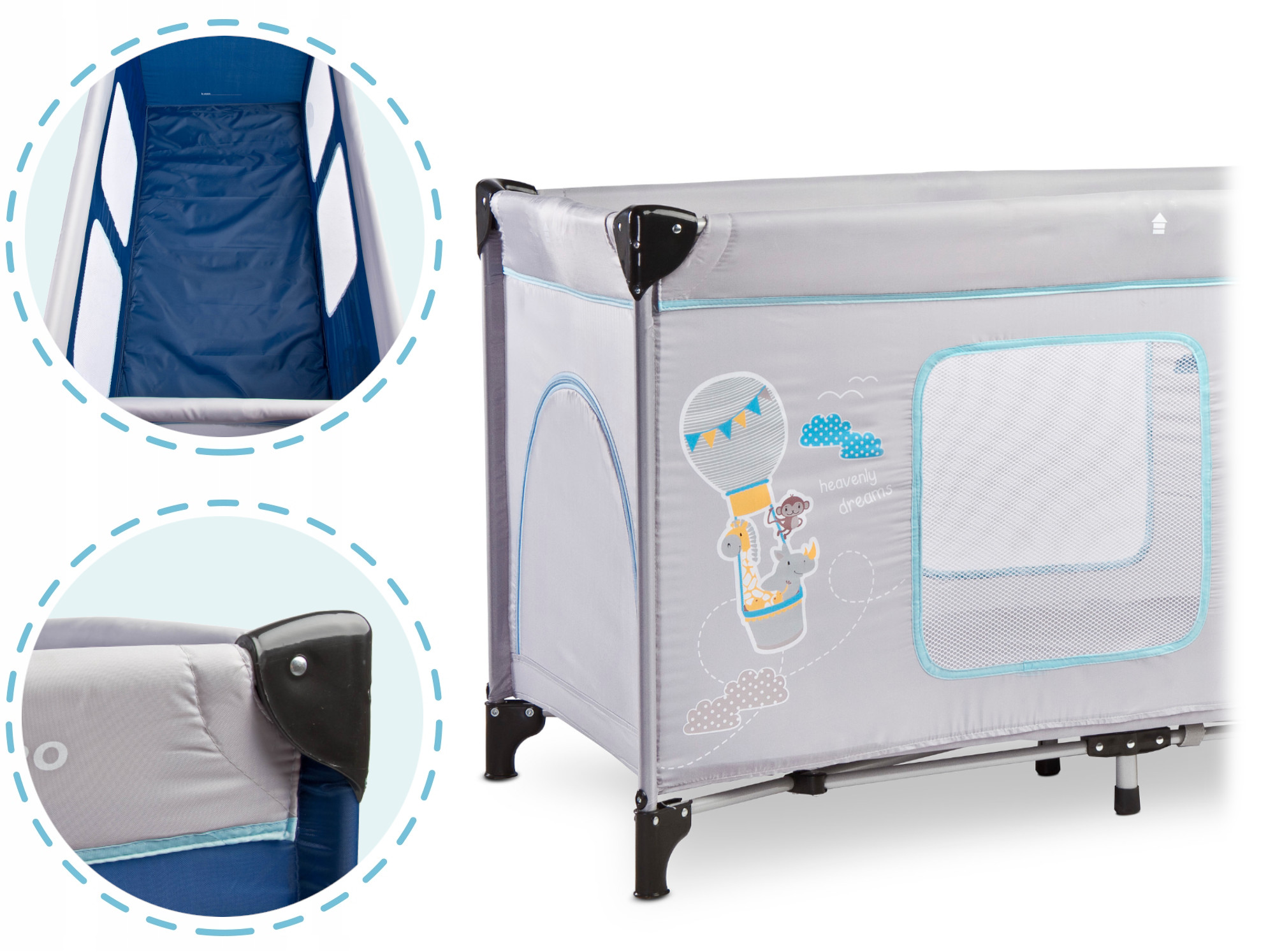 Łóżeczko wyposażone jest w wysokiej jakości matę o podwyższonej elastyczności, która pełni funkcję podłoża oraz miejsca zabawy. Utwardzony spód umożliwia swobodne stawianie pierwszych kroków oraz zapewnia bezpieczeństwo podczas zabawy, dzięki czemu maluszkowi nie grozi bolesny upadek. Pokryty tkaniną odporną na przetarcia oraz zabrudzenia.