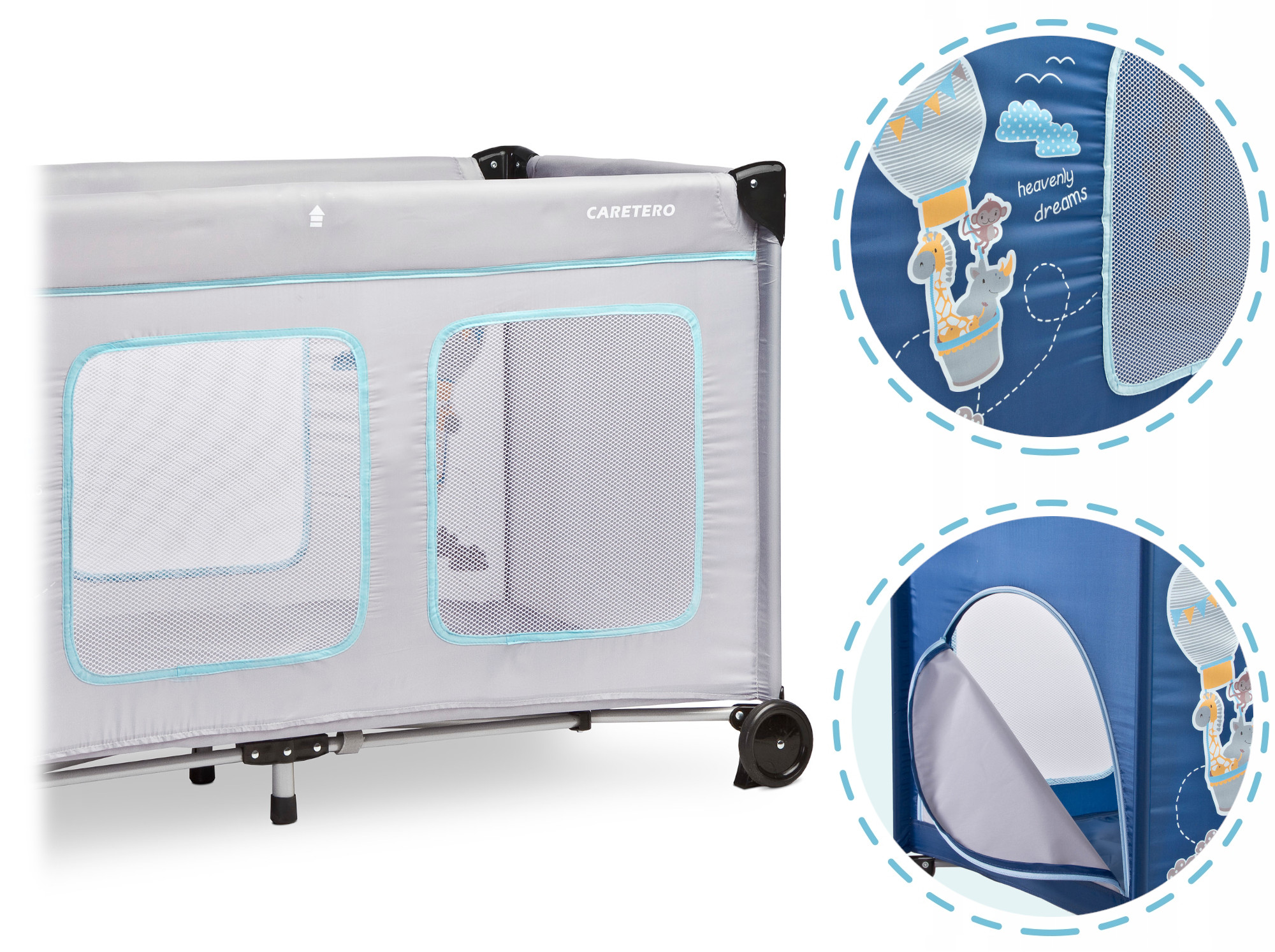 Na obu dłuższych i jednym krótszym boku znajdują się przewiewne siatki zapewniające odpowiednią cyrkulację powietrza i podgląd na pociechę.