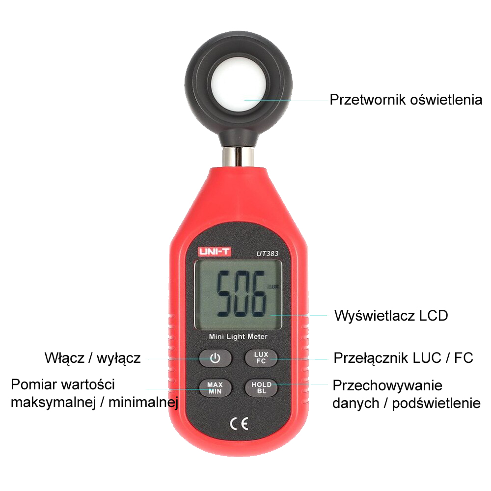 | Pomiar natężenia oświetlenia (LUX): | 0 ~ 199,900 luksów |