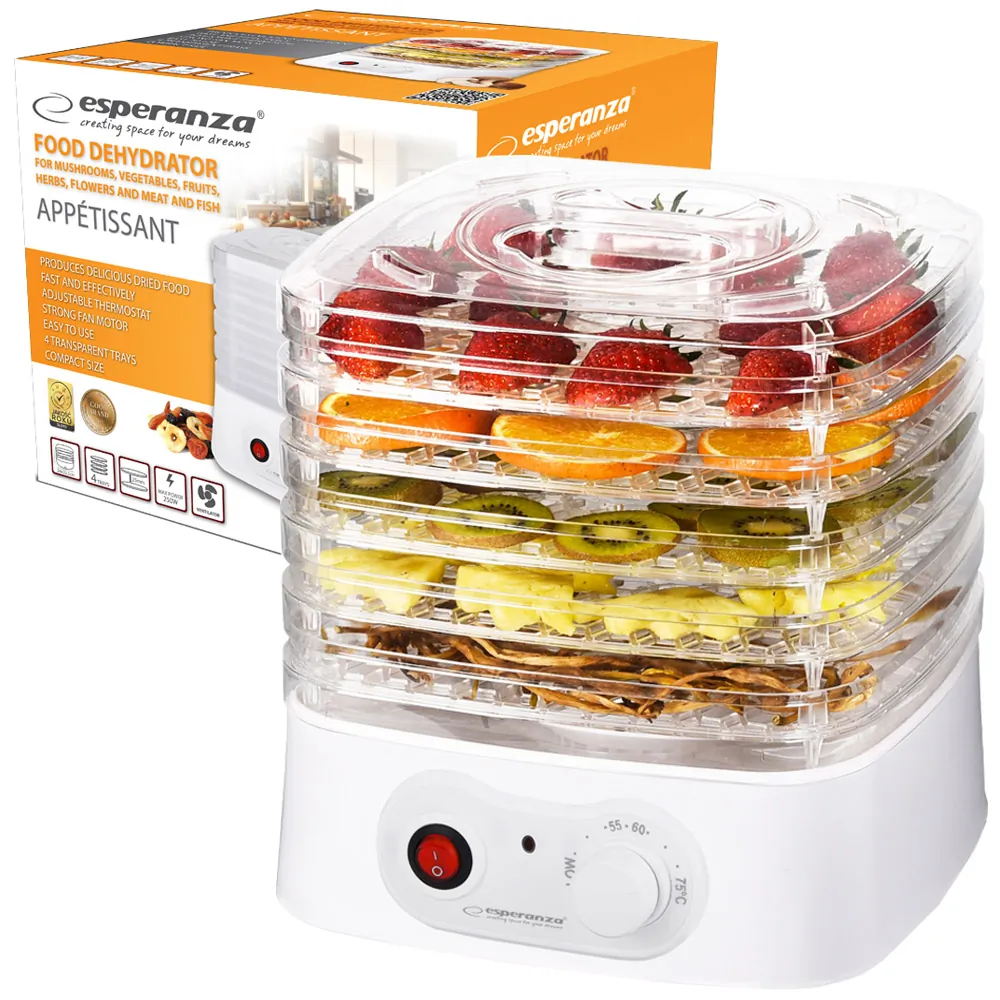 Suszarka do owoców, warzyw, grzybów, ziół z regulacją APPÉTISSANTSuszenie produktów to skuteczny i łatwy sposób na konserwację, zatrzymanie smaku i zapachu oraz wartości spożywczych suszonych produktów. Dzięki temu, przez cały rok, można delektować się smakiem owoców, warzyw czy grzybów bez dodatku konserwantów i innych sztucznych składników. Urządzenie to zachowuje smak i aromat ulubionych produktów na dłużej. Jest niezbędne w każdej nowoczesnej i zdrowej kuchni. Posiada dużą moc 250 W i wbudowany wentylator dzięki czemu produkty zostaną szybko, dokładnie i równomiernie wysuszone zachowując wszystkie walory zapachowe i smakowe. Jego kompaktowy rozmiar wpasuje się nawet do najmniejszej kuchni, a przechowywanie nie będzie już sprawiało problemu. |