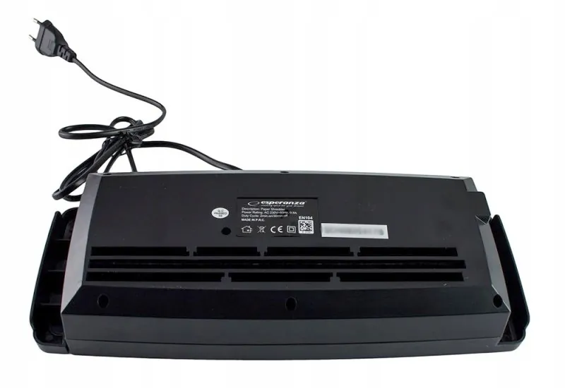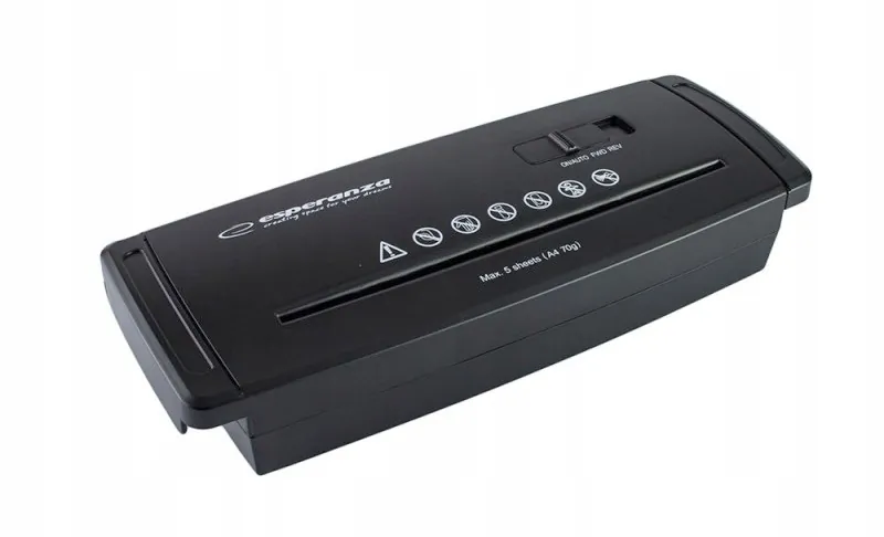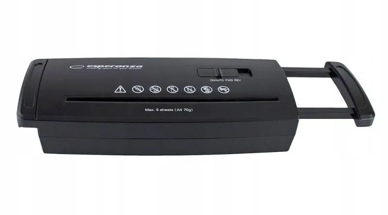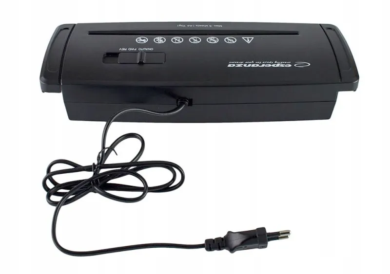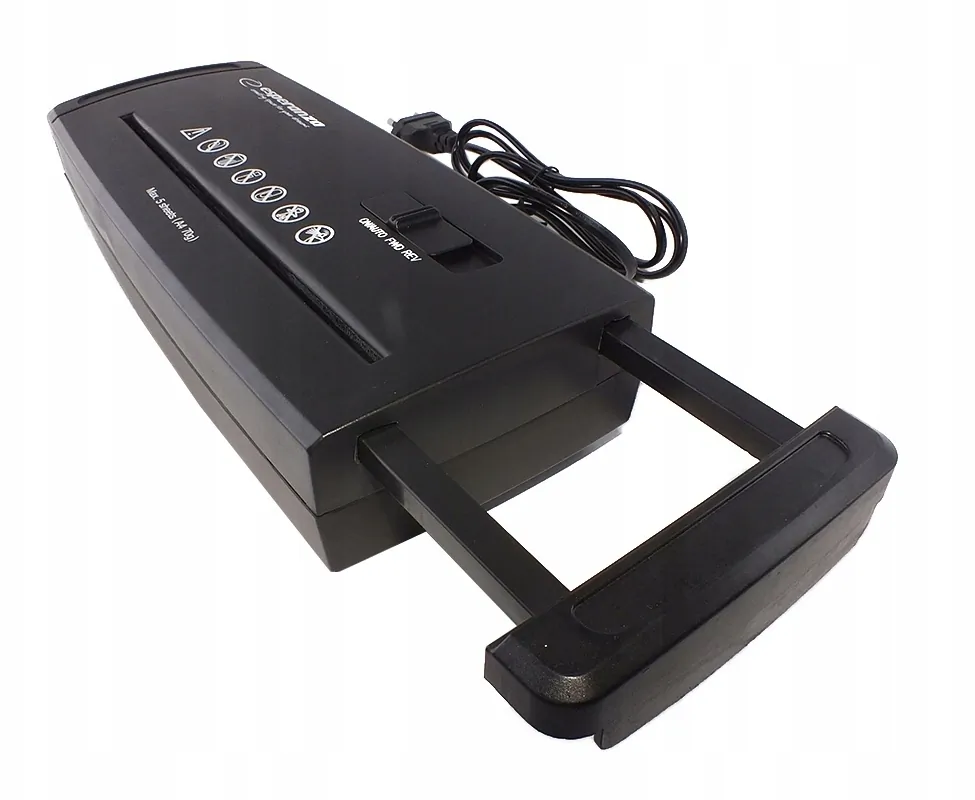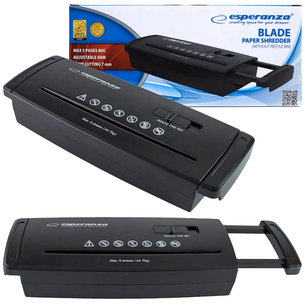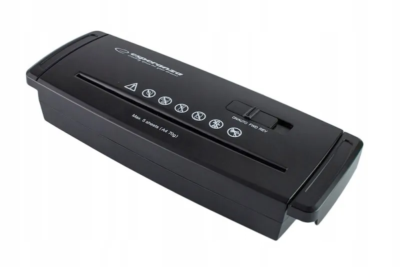 Niszczarka Esperanza BLADENiszczarka do papieru, Esperanza BLADE. Sprawnie niszczy jednocześnie do 5 arkuszy papieru (80g) w rozmiarze A4, zamieniając dokumenty w ścinki o szerokości ok. 7 mm. Niszczarka została wyposażona w blokadę bezpieczeństwa oraz wyłącznik termiczny. |