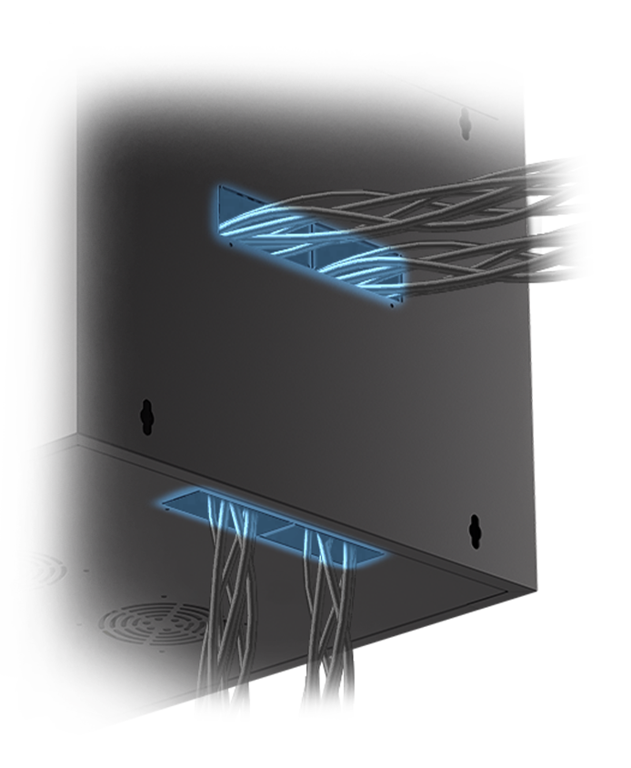 Sufitowy i podłogowy panel zawiera 2 miejsca na wentylatory (120 x 120 mm) oraz wyłamywane przepusty kablowe |