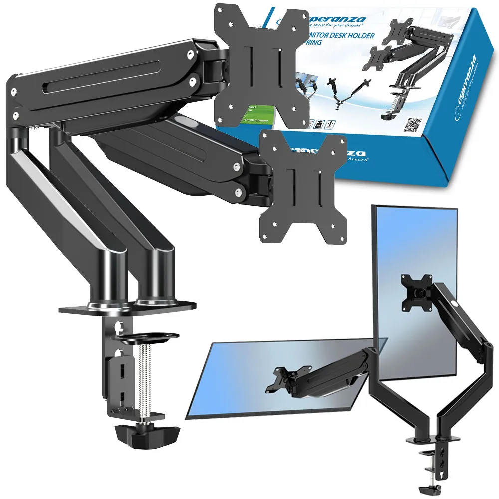 Metalowy, mocny i stabilny uchwyt biurkowy do 2 monitorów komputerowych w rozmiarze od 17” do 27”. Pozwala zamontować monitor komputerowy na biurku w taki sposób aby można go było swobodnie regulować pod kątem widzenia i wysokości, a równocześnie aby monitor nie zajmował miejsca na biurku. Łatwy w montażu. Przytwierdzany do biurka mocnym, regulowanym metalowym imadłem z miękką wyściółką zapobiegającą rysowaniu się blatu biurka. Zgodny ze standardem VESA 75 x 75 mm – 100 x 100 mm. Posiada szeroki zakres regulacji położenia monitora góra/dół, regulację kąta nachylenia monitora oraz możliwość jego obrotu o 360°.