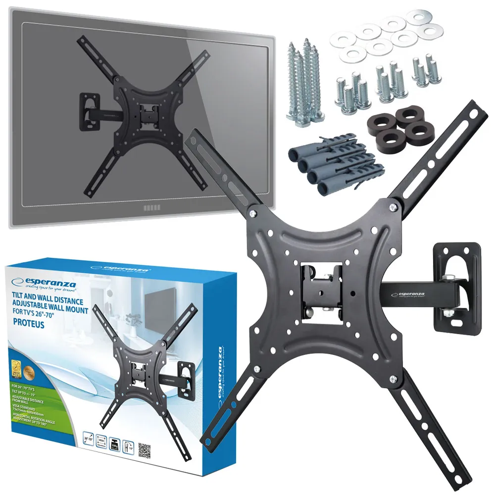 Metalowy, mocny uchwyt naścienny do telewizorów w rozmiarze 26” do 70”. Łatwy w montażu. Zgodny ze standardem VESA 75x75mm – 400x400mm. Posiada w zestawie małą poziomicę ułatwiająca wypoziomowanie uchwytu. Uchwyt posiada możliwość regulacji nachylenia, regulację kąta odchylenia w poziomie oraz regulację odległości telewizora od ściany.
