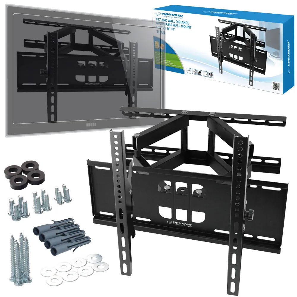Metalowy, mocny uchwyt naścienny do telewizorów w rozmiarze od 26” do 70”. Łatwy w montażu. Zgodny ze standardem VESA 75x75mm– 400x400mm. Posiada w zestawie małą poziomicę ułatwiająca wypoziomowanie uchwytu. Uchwyt posiada możliwość regulacji nachylenia, regulację kąta odchylenia w poziomie oraz regulację odległości telewizora od ściany.