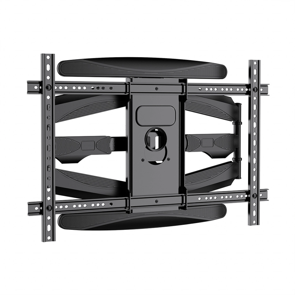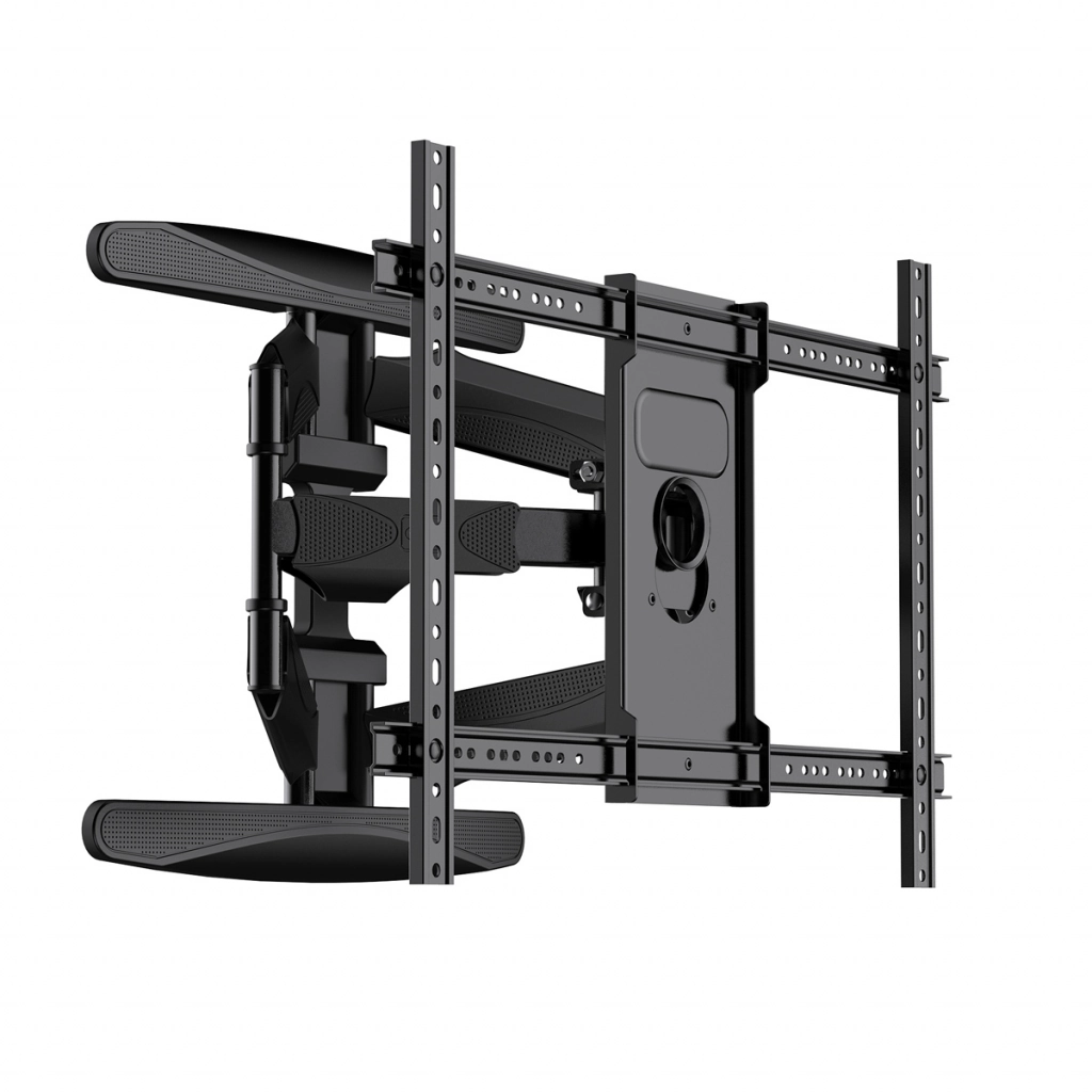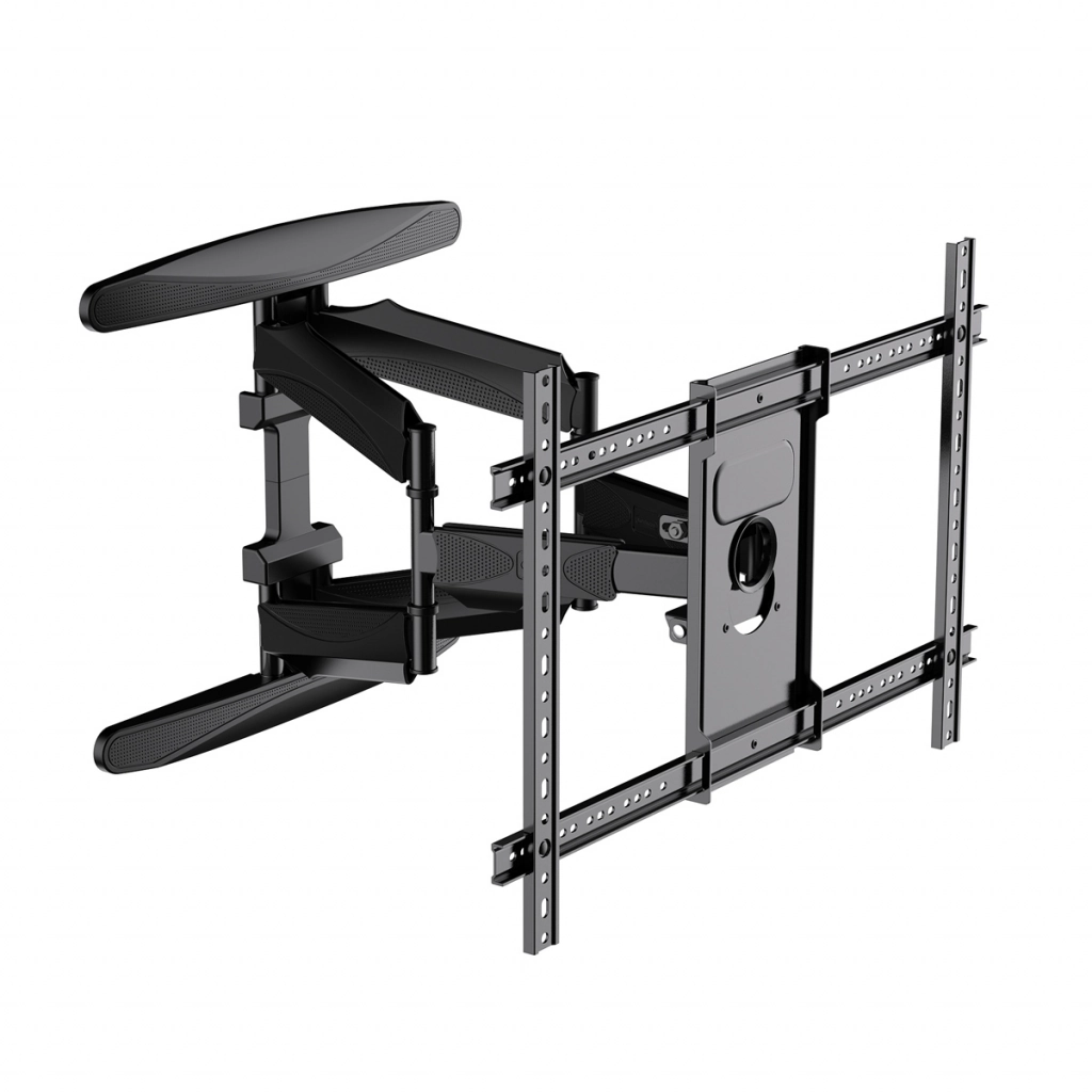 Uchwyt wykonano z trwałego metalu malowanego proszkowo na elegancki czarny kolor, dzięki czemu doskonale komponuje się z nowoczesnym wystrojem wnętrz. Regulowana odległość od ściany w zakresie 58–500 mm zapewnia pełną swobodę aranżacji przestrzeni. System zarządzania przewodami pozwala skutecznie ukryć kable, zapobiegając ich plątaniu i zgnieceniu, a rozbudowany system maskownic punktów montażowych gwarantuje estetyczne wykończenie instalacji. W komplecie znajduje się zestaw śrub montażowych, co sprawia, że instalacja uchwytu jest szybka, bezpieczna i intuicyjna.
