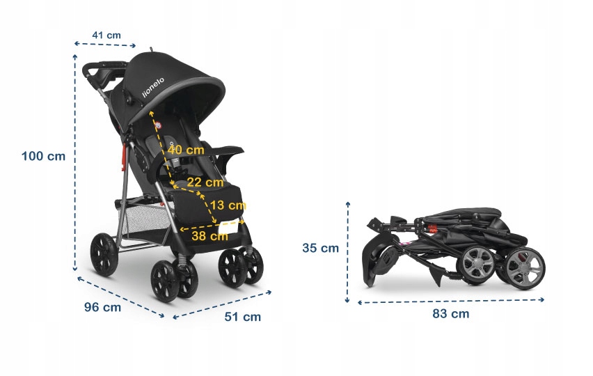 Wymiary złożonego wózka: 35 x 51 x 83 cm