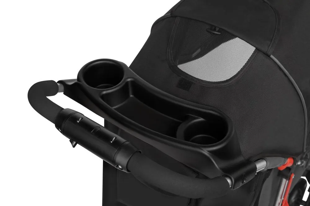 Na przedniej tacce znajduje się uchwyt na butelkę lub kubek oraz miejsce do zabawy. Można ją w prosty sposób zdemontować. Tacka stanowi również dodatkowe zabezpieczenie przed wypadnięciem z wózka.