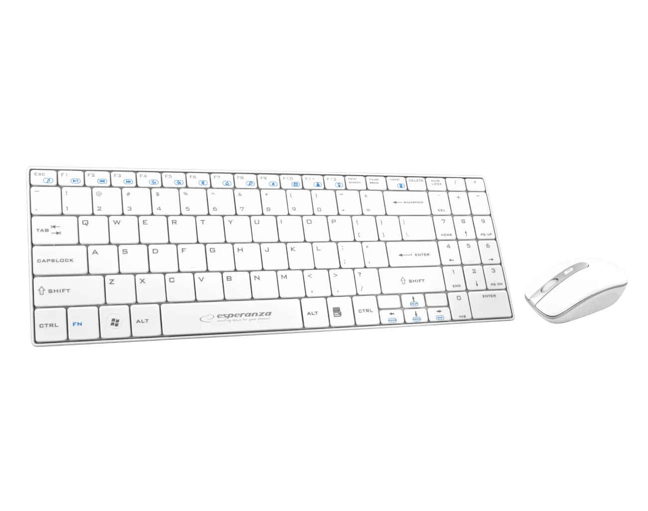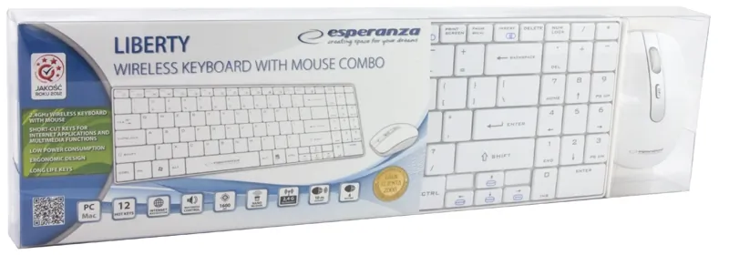 Zestaw bezprzewodowyWygodna, miła w dotyku, najnowszej generacji bezprzewodowa klawiatura multimedialna z myszką. Elegancki wygląd, niskie klawisze klawiatury i gładka, błyszcząca powierzchnia myszki sprawiają, że doskonale będą komponowały się na biurku z innymi akcesoriami. Litery oraz symbole zostały nadrukowane w najnowszej technologii UV i są pokryte specjalną warstwą ochronną nadającą im wysoką odporność na ścieranie. Wykonana z wysokiej jakości materiałów odpornych na elektryzowanie się. Zabezpieczona przed generowaniem interferencji elektromagnetycznych. Zestaw współpracuje zarówno z notebookami jak i komputerami stacjonarnymi.